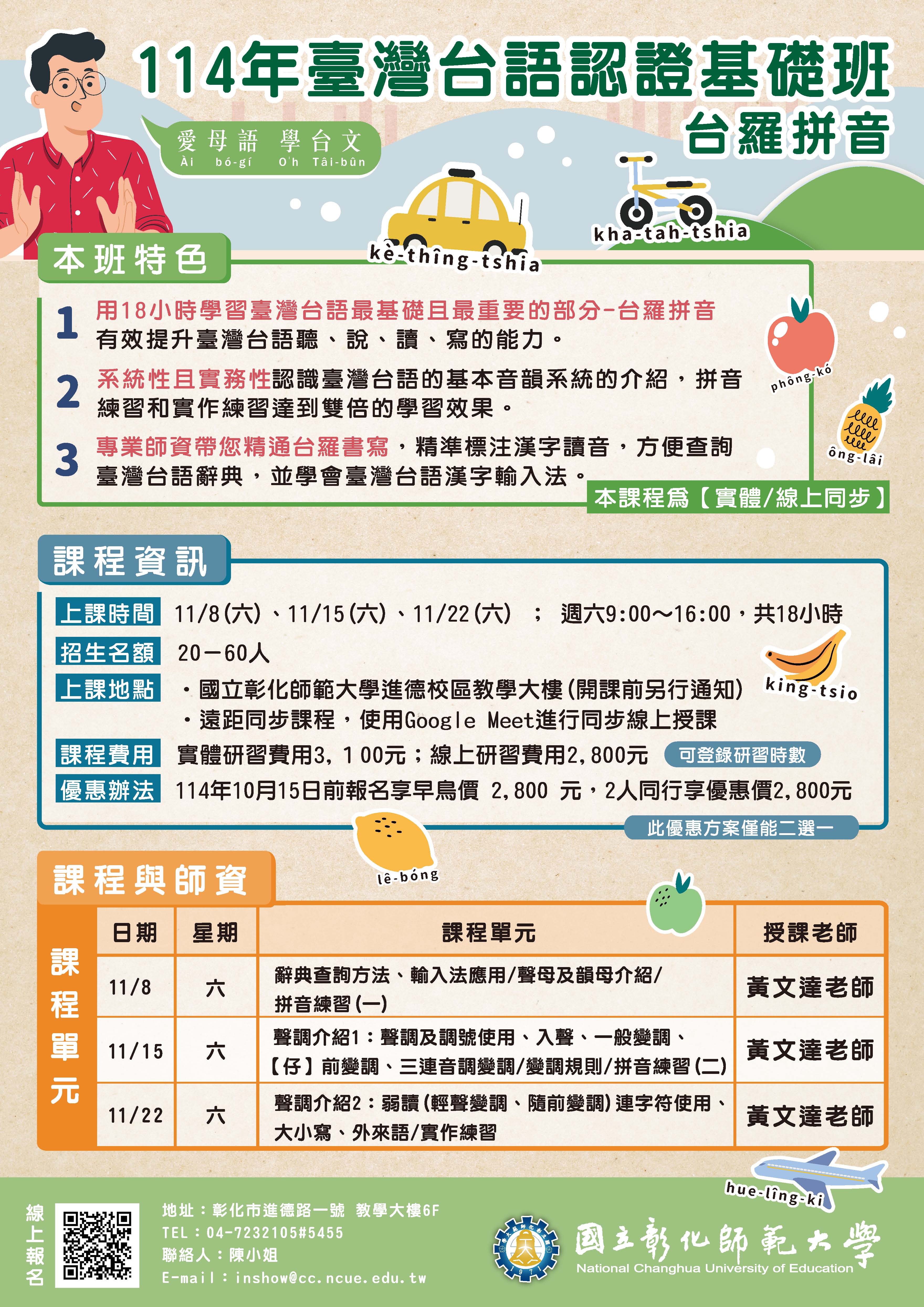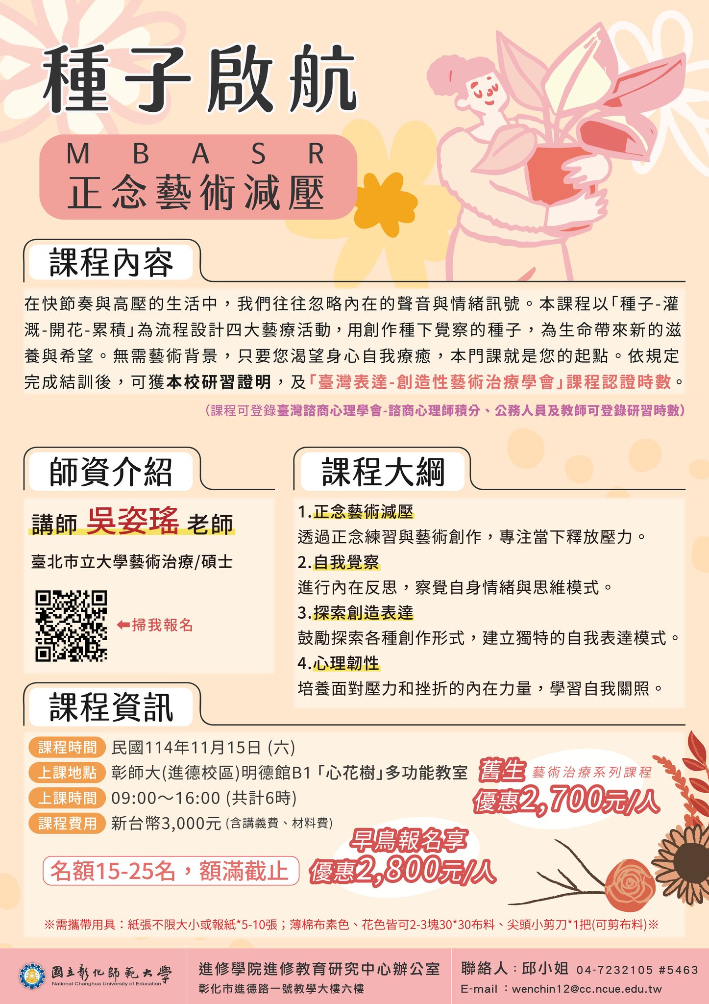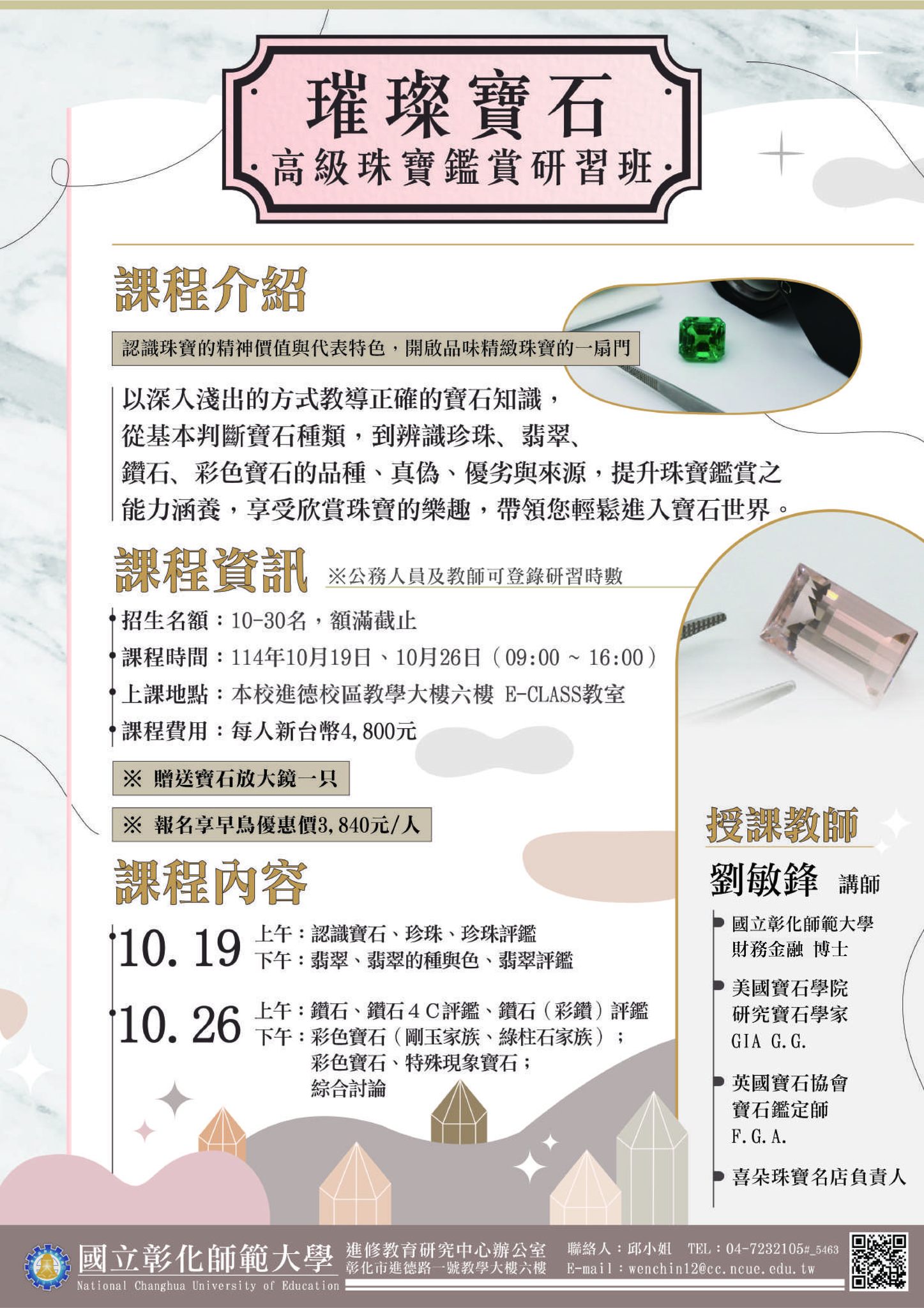 國立彰化師範大學進修學院推廣教育課程「【璀璨寶石】高級珠寶 鑑賞研習班」、「114年臺灣台語認證基礎班-台羅拼 音」、「種子啟航:MBASR正念藝術減壓」課程簡章