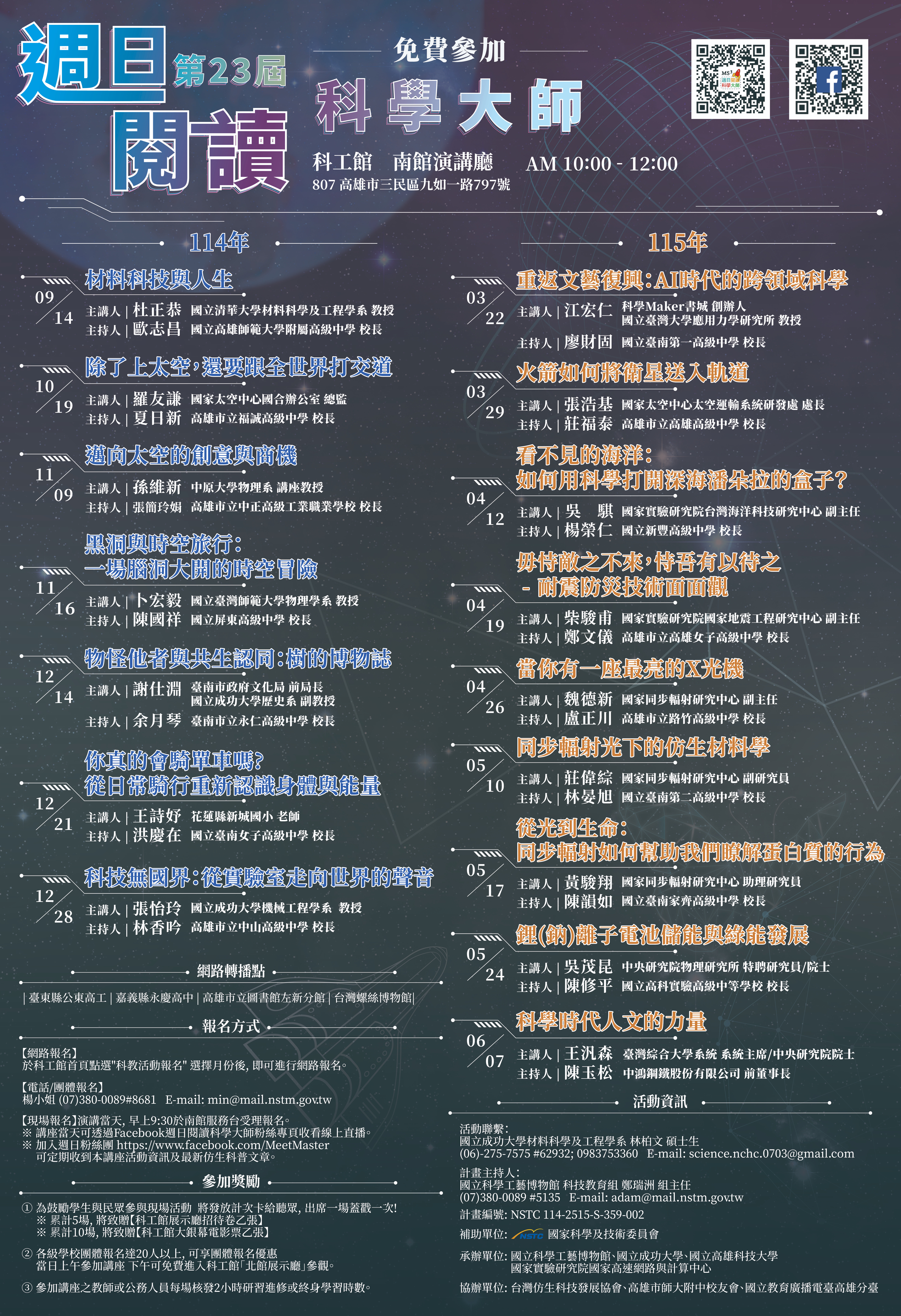 主旨:函轉國立科學工藝博物館辦理國科會補助「第23屆週日閱讀科學大師」系列科普講座相關資訊,請鼓勵師生踴躍報名參加,請查照。