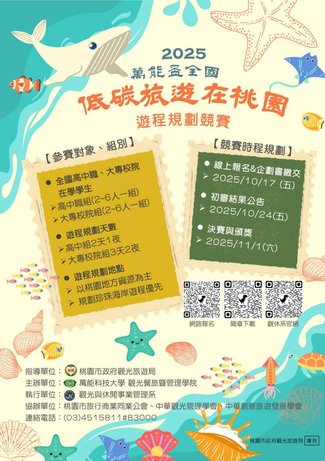 一、本校觀光與休閒事業管理系主辦「2025萬能盃全國『低碳旅遊在桃園』遊程規劃競賽」,將於114年11月01日(星期六)於本校舉行。