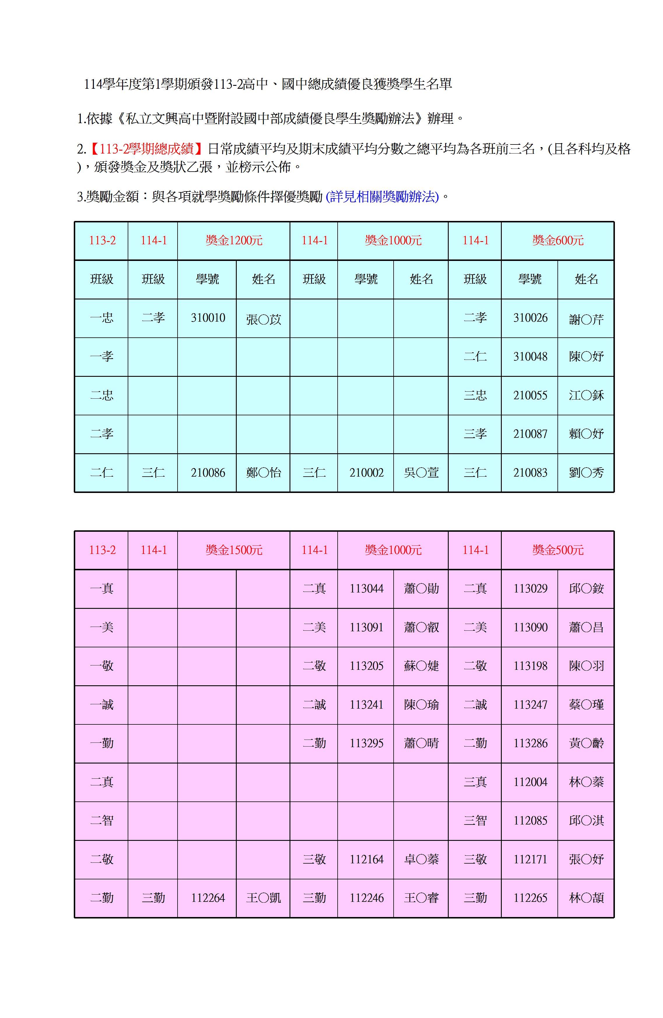 114-1頒發113-2各班前三名獎學金名單