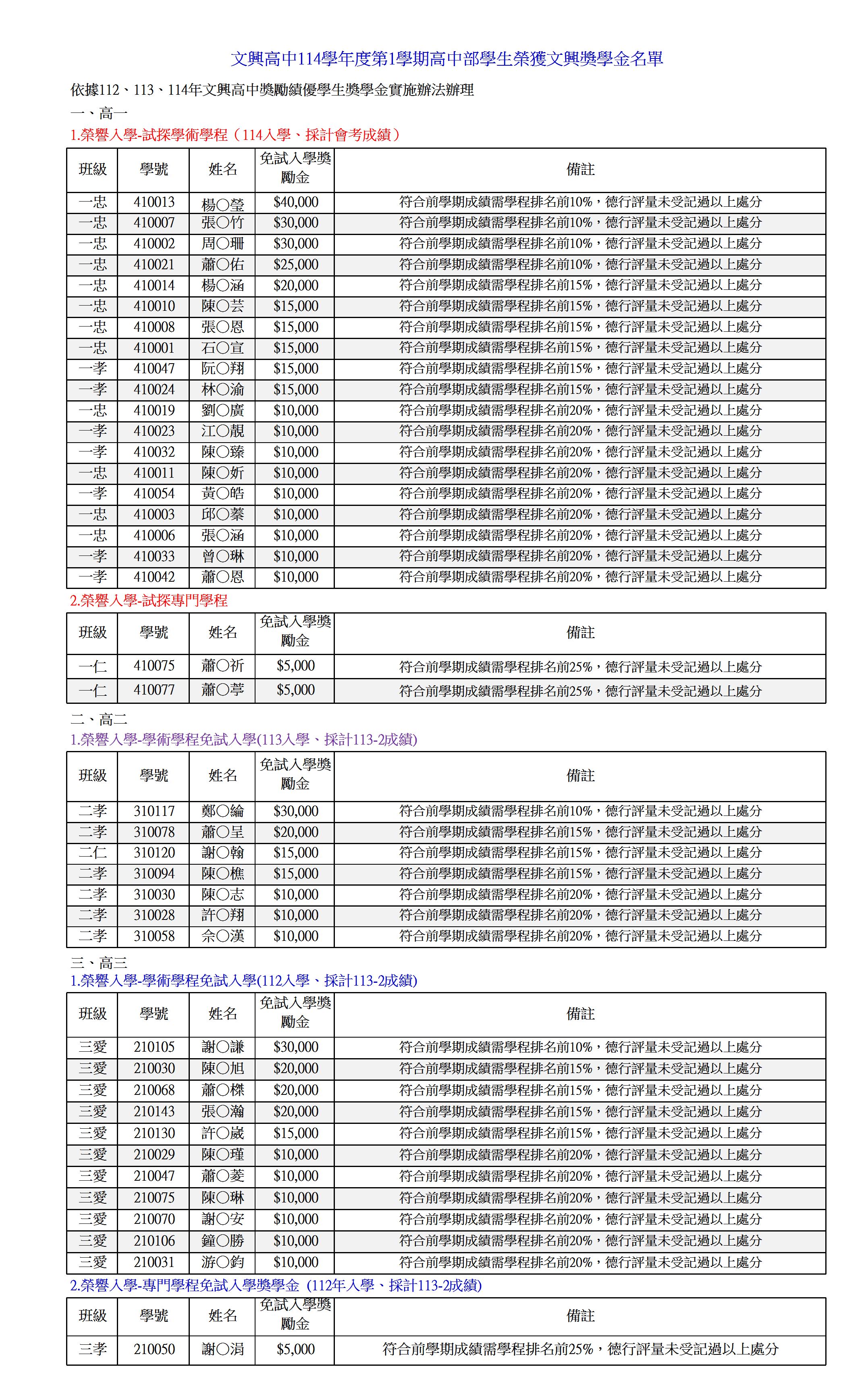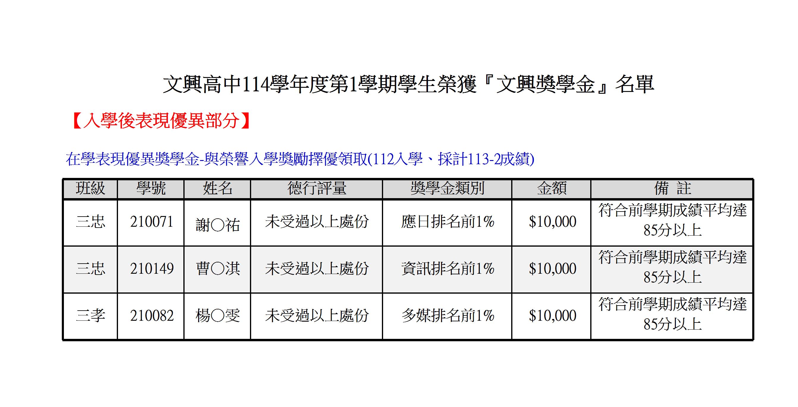 114-1高中部榮獲文興獎學金名單