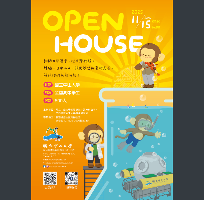 主旨:本校辦理「OPEN HOUSE 校園開放日」活動,請惠予公告並轉知貴校學生踴躍參加,請查照。 說明: 一、為協助高中學生跳出原有學習之框架模式,體驗本校跨領域課程與特色體育活動,特以專業課程、實驗室參訪及海域活動體驗等形式辦理校園開放日,讓學生親自感受大學學習氛圍,提前認識大學生活,爰邀請全國高中學生共襄盛舉,體驗一日中山人的課堂日常。 二、旨揭活動訂於114年11月15日(星期六)上午8時30分至下午4時,於本校各場館舉行。活動內容包括:單日校園開放參觀、學系專業課程、實驗室實作體驗、跨領域工作坊、專題講座及海域休閒活動。 三、活動報名表單於114年9月22日開放,網址為https://nsysu.surveycake.biz/s/LN2rd。報名截止日為10月26日。本活動全程免費。 四、更多活動資訊及最新公告,詳見活動臉書粉絲專頁https://www.facebook.com/NSYSUopenhouse。 ![]() ![]() 瀏覽數