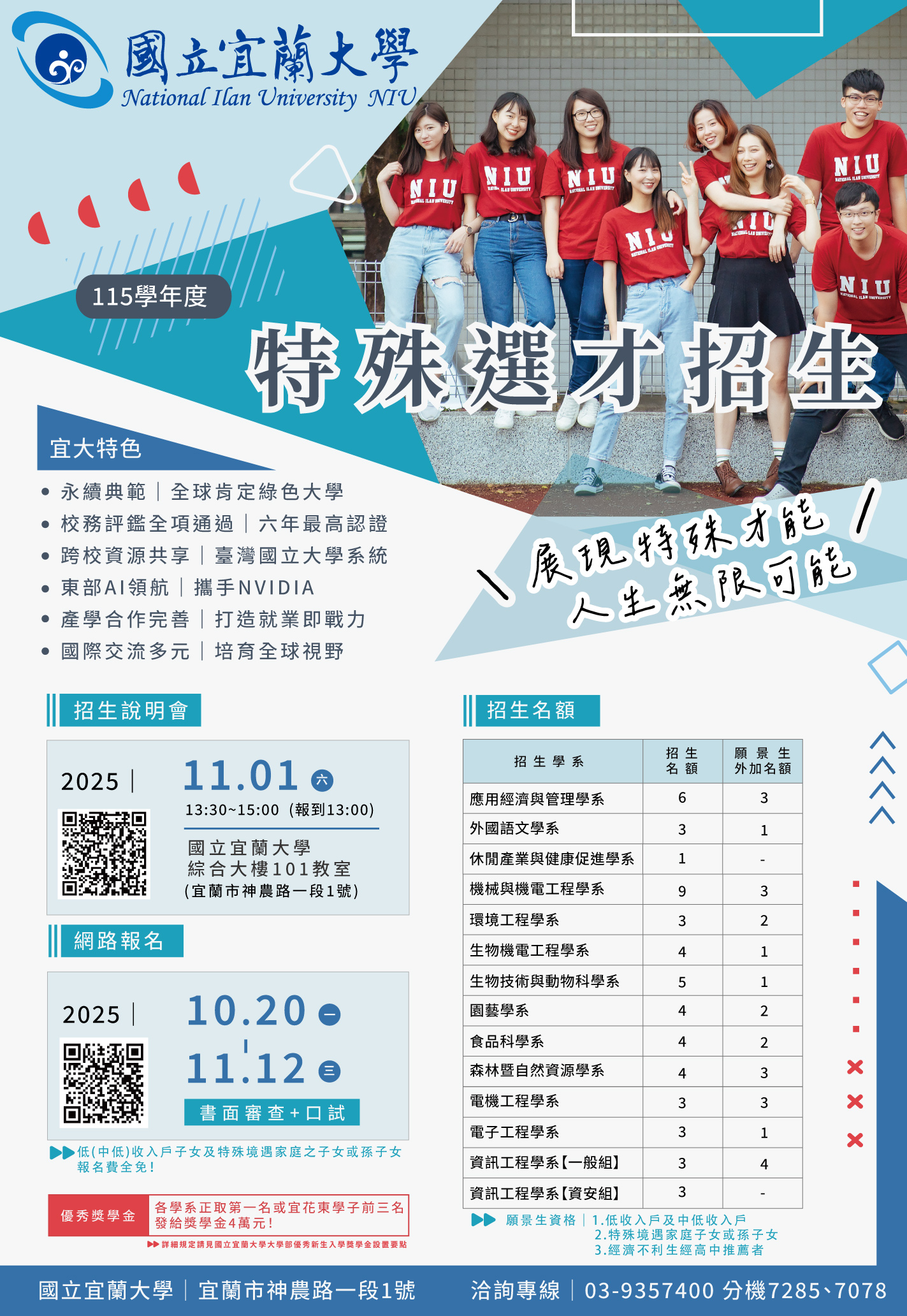 國立宜蘭大學115學年度學士班特殊選才招生資訊暨招生說明會報名網址