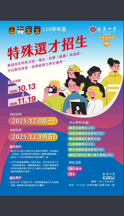 一、本校為鼓勵具特殊才能、專長、經歷(競賽)或成就,不同教育背景及弱勢族群之學生進入大學就讀,特辦理115學年度特殊選才招生。