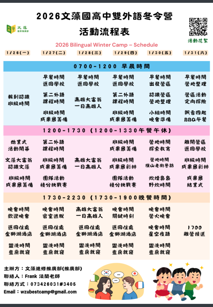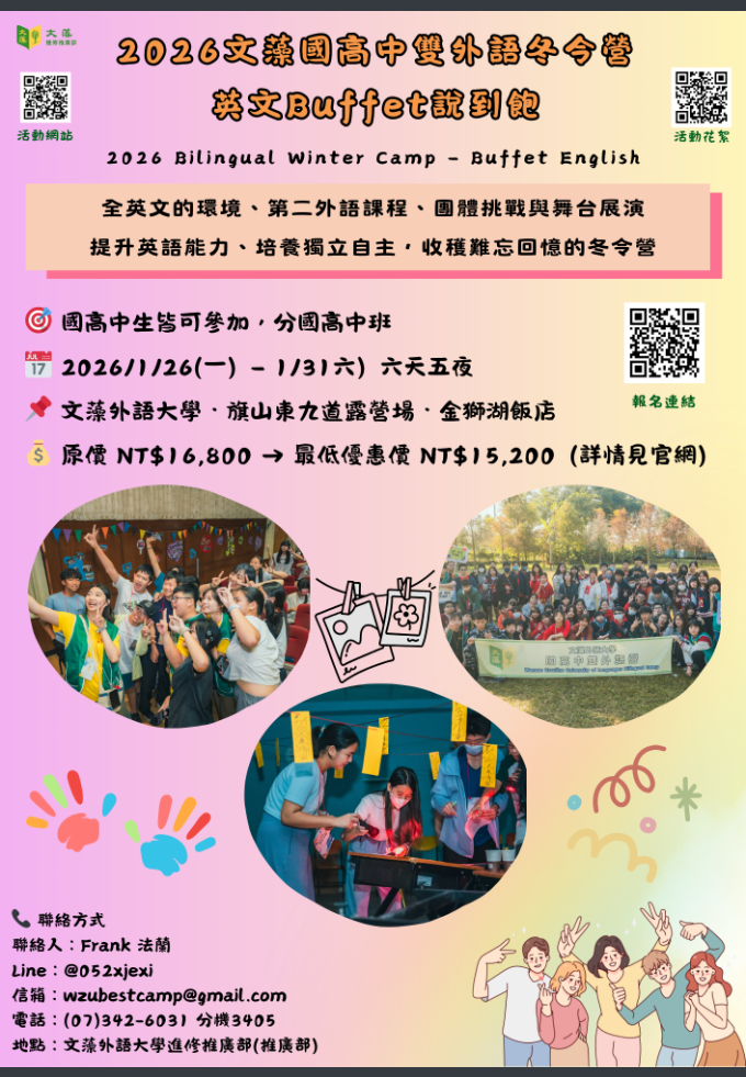 一、時間:民國115年1月26日(一)至1月31日(六),共6天5夜。 二、地點:本校、高雄市區及旗山東九道露營場。 三、活動對象:國中一至三年級學生、高中一至三年級學生。 四、活動人數:100人/梯次,額滿為止。 五、詳情可至本校進修推廣部網頁查詢:https://dee.wzu.edu.tw/Course/3900,或洽專線(07)3458212