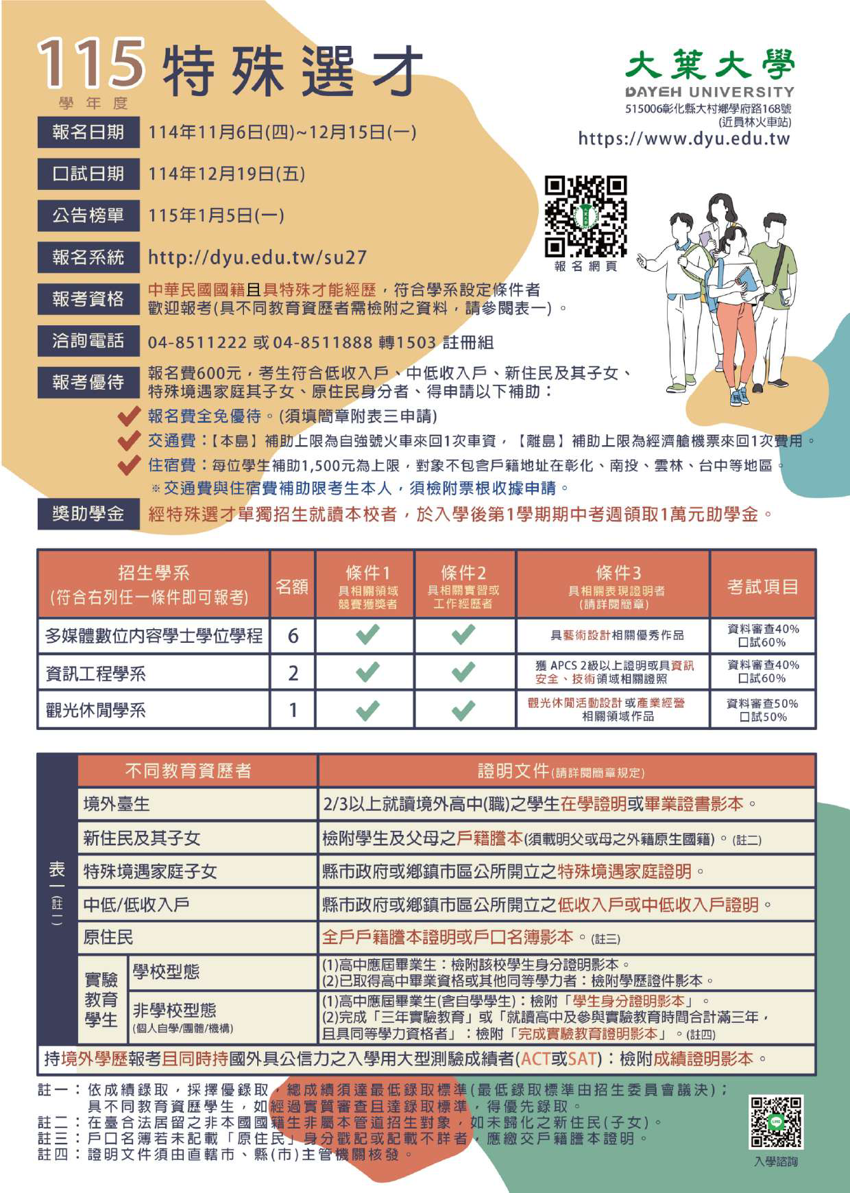 說明: 一、招生簡章電子檔公告於本校網頁http://dyu.edu.tw/su27,歡迎免費下載。 二、招生學系(名額):資訊工程學系(2名)、多媒體數位內容學士學位學程(6名)、觀光休閒學系(1名)。 三、報名日期:自114年11月6日(星期四)起至114年12月15日(星期一)止,採網路報名並郵寄書審資料(規範文件請詳閱簡章)。 四、口試日期:114年12月19日(星期五)10:00-15:00,擇一時段應試。 五、各系報考資格,請參閱招生文宣並詳閱招生簡章資訊。考生符合「低收入戶、中低收入戶、新住民及其子女、特殊境遇家庭子女或原住民身分者」,本校另有免報名費或交通與住宿費之補助,敬請師長踴躍推薦所屬學生報考。 六、如有任何疑問,歡迎電洽04-8511888轉分機1503。