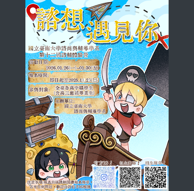 說明: 一、活動名稱:臺南大學第十二屆諮輔體驗營-諮想遇見你。 二、活動日期:115年1月26日(一)至115年1月30日(五)。 三、活動地點:本校府城校區(臺南市中西區樹林街二段33號)。 四、費用:個人報名,新台幣6,000元;團體報名(3人以上),新台幣5,500元/每人。 五、報名日期:114年11月8日(六)至11月23日(日)止。 六、報名連結:https://forms.gle/AGqHZ2HnQhokz99L8。 七、檢附活動海報如附件,請參閱。