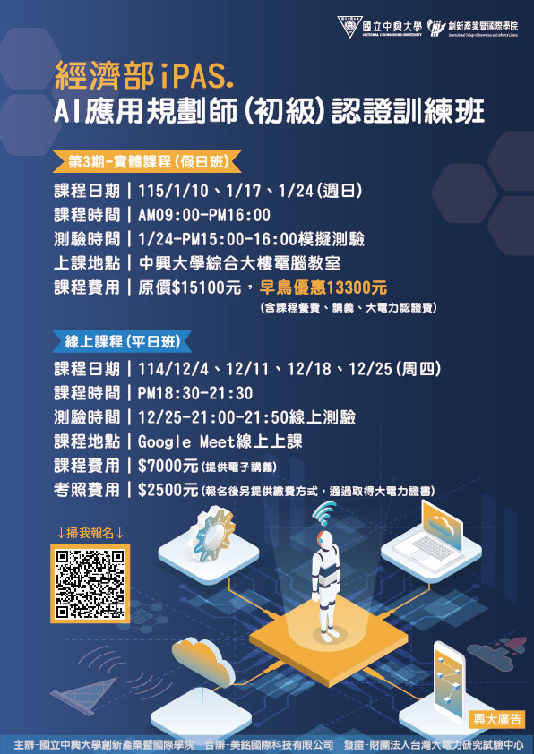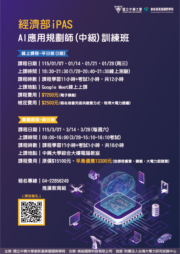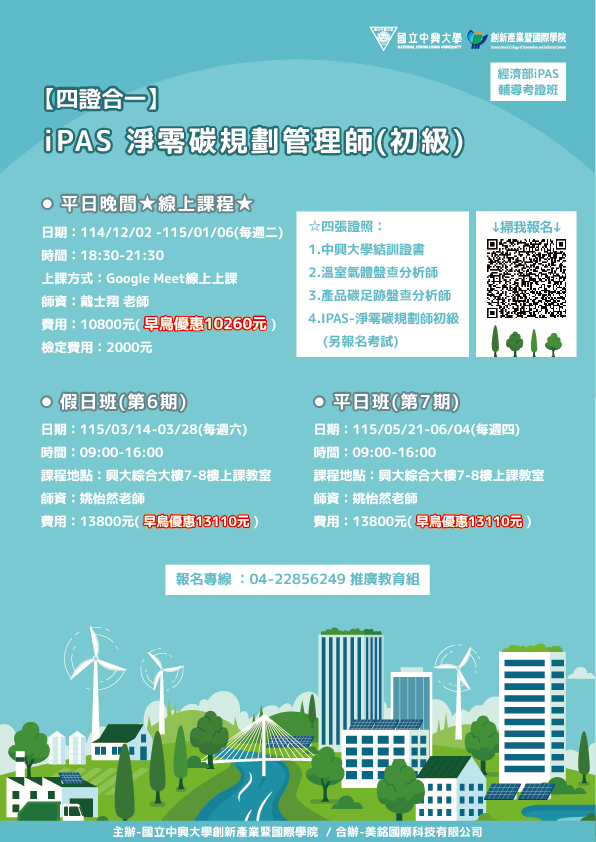 國立中興大學「四證合一-經濟部 iPAS 淨零碳規劃管理師(初級)輔導考證班、經濟部iPAS-AI應用規劃師(初級、中級)輔導訓練班」招生訊息