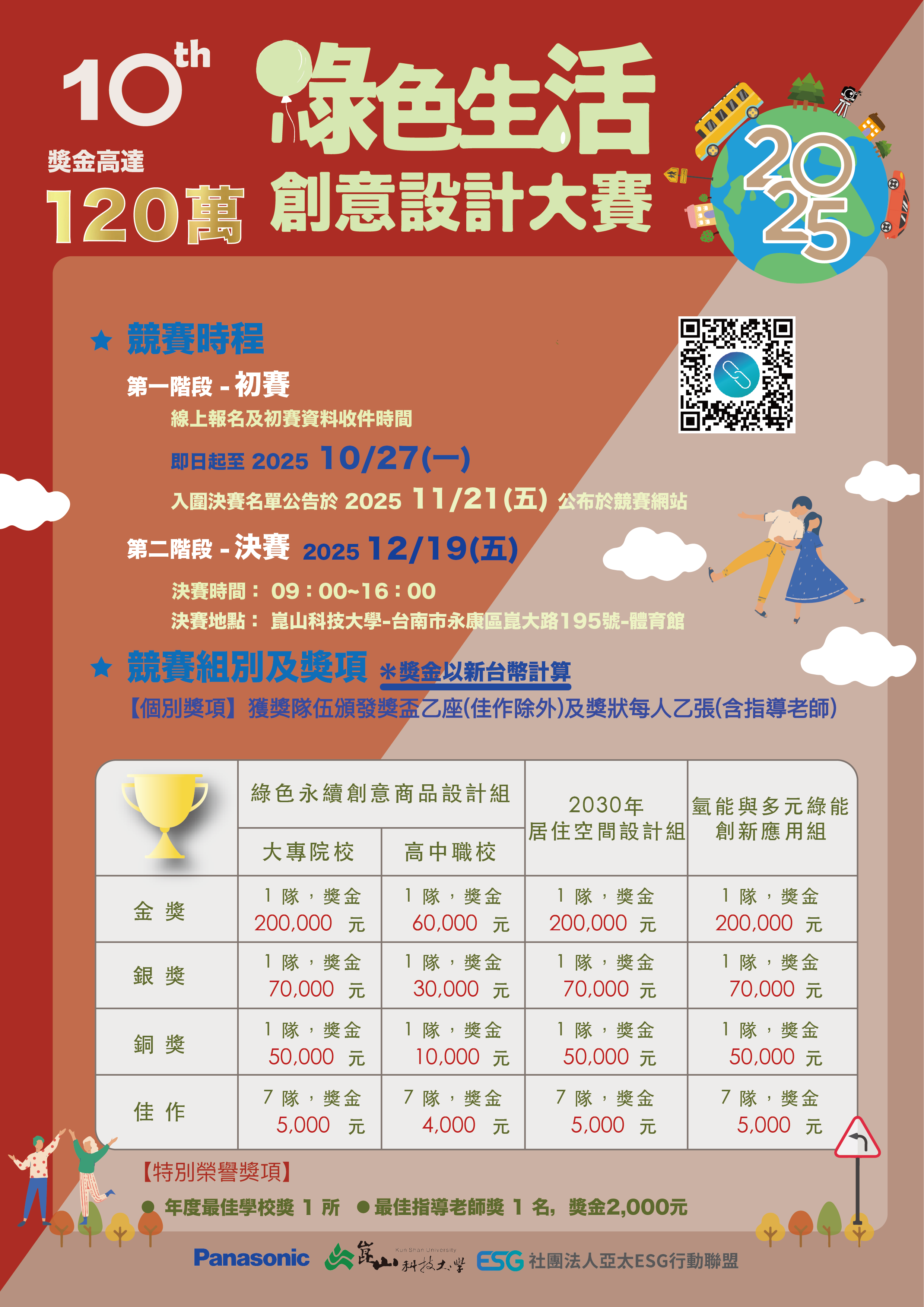 說明: 一、台灣Panasonic集團自2015年每年定期舉辦「綠色生活創意設計大賽」,本校延續前九屆綠色生活創意設計大賽精神舉辦「第十屆2025 綠色生活創意設計大賽」,讓創造美好生活的核心精神從校園、城市開始深化,激發學子們對「淨零碳排與智慧低碳生活、永續能源」,共同建立永續的未來。 二、辦理單位:主辦單位-台灣Panasonic集團;承辦單位-崑山科技大學;協辦單位-社團法人亞太ESG行動聯盟。 三、報名時間:延期至114年10月27日止受理報名。 四、報名方式:參賽隊伍必須先至「第十屆2025 綠色生活創意設計大賽」網站下載競賽簡章:https://greenlife.ksu.edu.tw/,如附件一所示。 五、競賽聯絡人:賴榮彬專案經理,電話:06-272-7175#540,電子信箱:panasonicksu@gmail.com