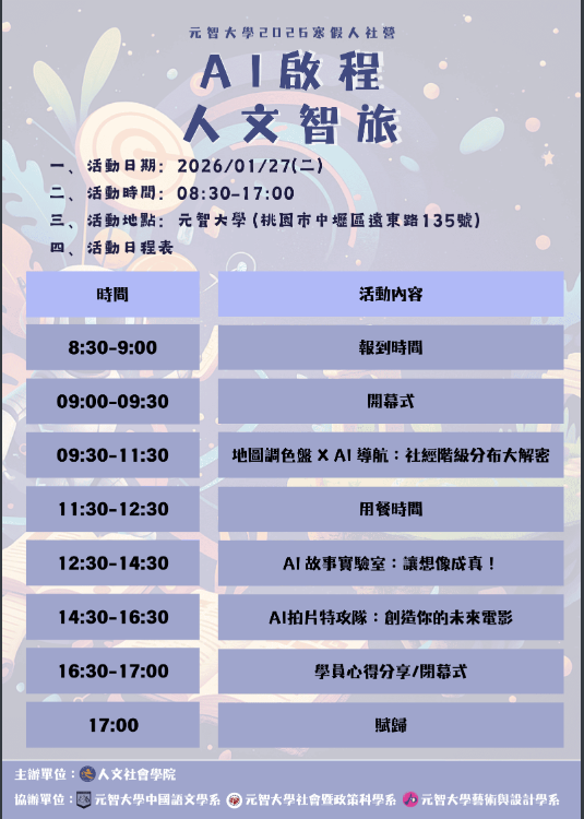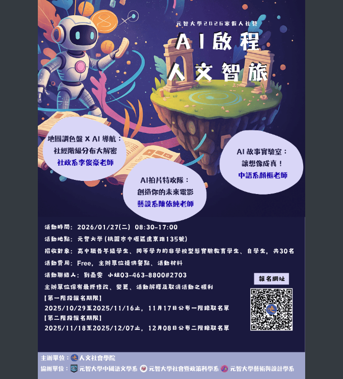 一、活動名稱:元智大學2026寒假人社營-AI啟程:人文智旅。 二、活動時間:2026年1月27日(二) 上午8時30分至下午5時。 三、活動地點:元智大學 (桃園市中壢區遠東路135號)。 四、招收對象:高中職各年級學生、同等學力的非學校型態實驗教育學生、自學生,共30名。 五、活動報名:2025年10月29日起至12月7日止。 (一)第一階段報名期限:2025年10月29日至2025年11月16日止,於11月17日公布一階錄取名單。 (二)第二階段報名期限:2025年11月18日至2025年12月7日止,於12月8日公布二階錄取名單。 六、報名方式:線上報名,活動報名網址:https://portalx.yzu.edu.tw/PortalSocialVB/FPage/PageActivityDetail.aspx?Menu=Act&ActID=15979。 七、活動費用:免費,主辦單位提供餐點、活動材料。 八、隨函檢附:活動海報、活動日程表。 九、活動聯絡人:元智大學人文社會學院劉嘉雯小姐,電話:03-4638800轉分機2703。若有任何疑問,請來電洽詢。