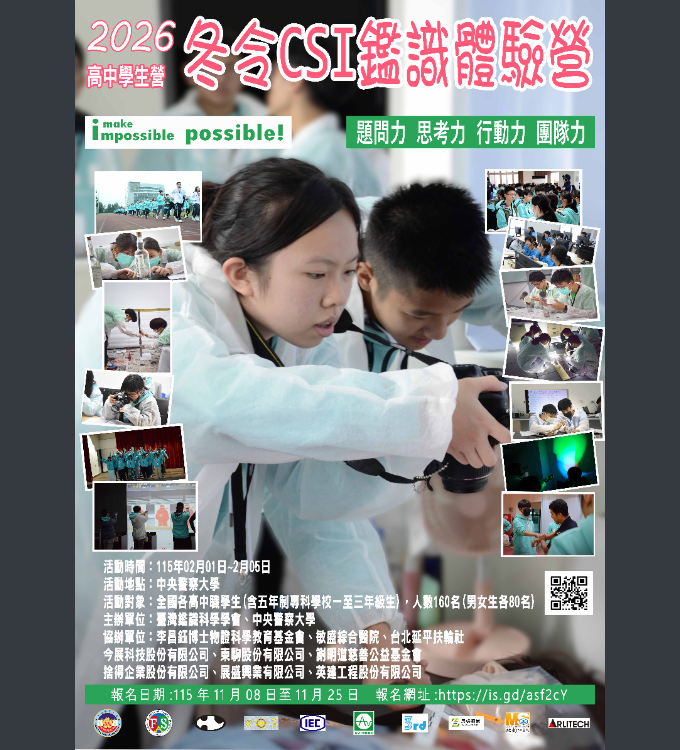 社團法人臺灣鑑識科學學會與中央警察大學謹訂於115年2月1日至2月5日共同舉辦「2026冬令CSI鑑識體驗營」高中學生營