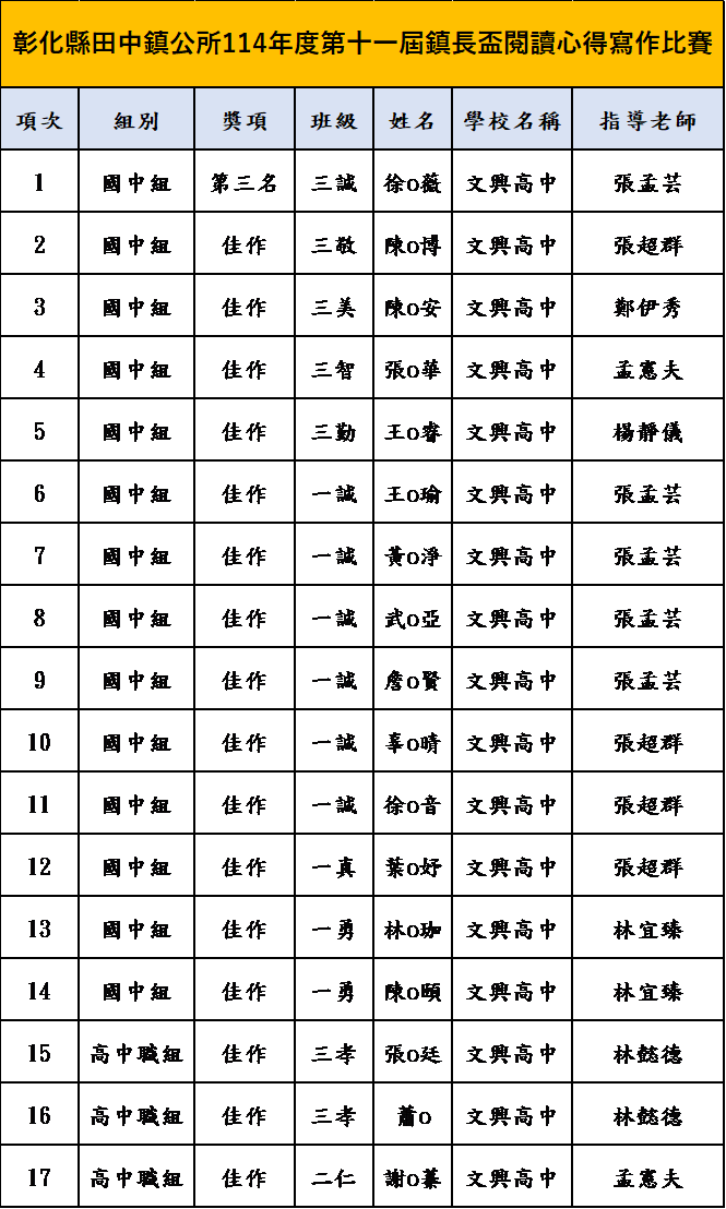 彰化縣田中鎮公所114年度第十一屆鎮長盃閱讀心得寫作比賽得獎名單(文興高中)oo.docx