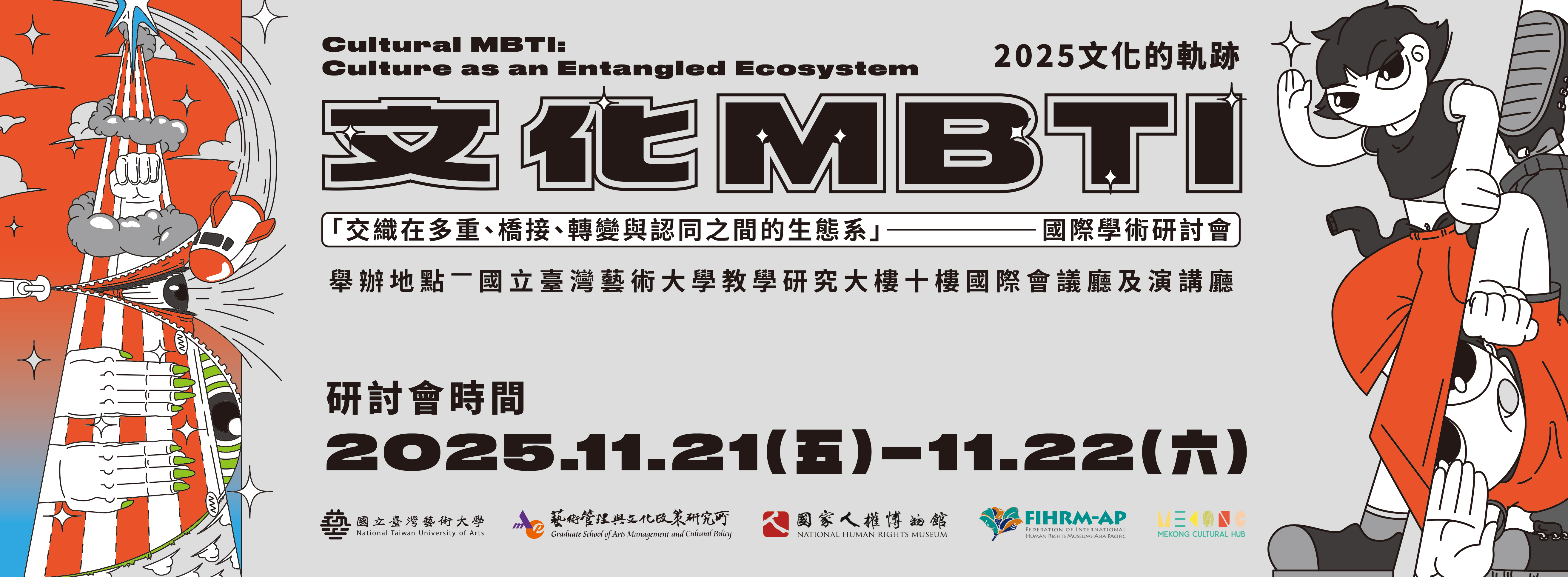 說明: 一、本校藝術管理與文化政策研究所、國家人權博物館、國際人權博物館聯盟-亞太分會、國際生活藝術組織台灣辦事處(又名:湄公河文化中心)合辦之「文化 MBTI——交織在多重、橋接、轉變與認同之間的生態系」-國際學術研討會於114年11月21日、22日在本校教學研究大樓10樓國際會議廳、演講廳舉行。 二、本次研討會以「文化 MBTI」為題,提出跨學科思考框架,探討文化在當代表現中的多重面向與生成路徑。若將文化視為具適應性與生成力的「性格型態」,我們得以跳脫單一視角,重新理解文化如何在多元處境中形構與變動。聚焦「Multiple(多重)」、「Bridge(橋接)」、「Transformation(轉變)」與「Identity(認同)」四大主題,剖析文化於不確定時代中的動態軌跡,並思考文化政策、治理與未來發展的可能方向。 三、此次研討會邀請英國萊斯特大學Yunci Cai副教授及各領域專家學者。 (一)相關資訊參閱研討會官網:https://www.amcp2025cts.com/ (二)報名網址:https://www.accupass.com/go/amcp2025cts(當天憑劵用餐)。 (三)參加研討會者可以登錄公務人員學習時數認證。 四、敬請協助公告,鼓勵師生及同仁踴躍參加。