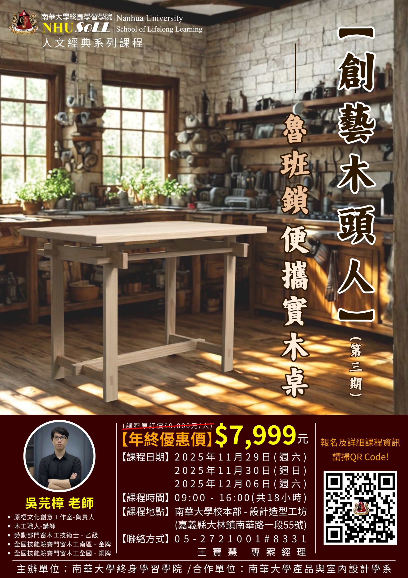 說明: 一、用木頭溫度創造精采生活:解析魯班鎖(孔明鎖)的榫卯結構奧秘與三維空間邏輯。引導學員將傳統無釘榫接的智慧融入現代設計構思,從零開始,將魯班鎖的精巧結構轉化為可實際應用的便擕實木桌,實現創意與經典工藝的結合。 二、課程特色: (一) 課程採小班制教學:限招15位學員,全國金牌講師提供更完善的指導與協助。 (二) 獨立製作出一張具備魯班鎖結構、可拆解收納的便擕實木桌。 (三) 實作導向教學:課程強調「實作」,採用「講解」、「示範」、「練習」教學方式,學員將有充足的時間練習木工技法,並完成個人作品。 三、上課日期:114年11月29日(星期六)、11月30日(星期日)、12月6日(六)。 四、課程地點:本校校本部設計造型工坊(嘉義縣大林鎮南華路一段55號)。 五、講師:吳芫樟老師。 六、【年終優惠價】新台幣7,999元(課程原定價:新台幣9,800元) 七、線上報名網址:https://lihi3.me/ihWkh。 八、課程單元內容:請參見附件課程海報、招生簡章。 九、【聯絡電話】05-2721001分機8332 王寶慧專案經理。