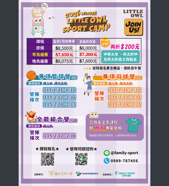 說明: 一、課程目的:為培養學童運動興趣、強化體適能表現,並提供優質安全之運動學習環境,本校規劃辦理「2026運動冬令營」,開設籃球、羽球專項訓練及全能運動主題營隊,由專業師資授課。 二、招生對象: (一)國小組:國小一年級至六年級學童。 (二)國高中組:國中一年級以上之青少年。 三、課程資訊如下: (一)第一梯次(5日):115年1月26日至1月30日 (二)第一梯次(5日):115年2月2日至2月6日 (三)第三梯次(5日):115年2月9日至2月13日 (四)上課地點:國立中興大學室內體育館(足球課程採室外場地)。 (五)課程費用: 1、籃球/羽球專項營:新臺幣7,650元(原價8,500元)。 2、全能運動:新臺幣7,200元(原價8,000元)。 (六)報名方式:請至「國立中興大學創新產業暨國際學院線上報名繳費系統」報名,免費加入會員後即可完成報名作業。 (七)報名網址:https://reurl.cc/6bEQ36 (八)檢附課程海報1份,敬請協助公告與宣傳,請惠允周知。