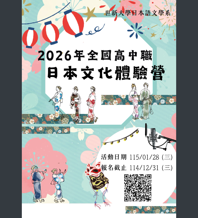 一、為增進青年學子對日本文化之了解,特舉辦旨揭活動,盼藉此活動提升高中職學生之跨文化溝通能力。請協助宣傳刊登電子布告欄,並鼓勵學生參加。 二、活動名稱:2026年全國高中職日本文化體驗營。 三、活動時程:(一)報名時間:即日起至114年12月31日止(二)活動時間:115年1月28日(三)活動地點:世新大學 四、點選簡章連結或掃描QRcode線上報名。將於115年1月21日前以電子郵件寄發行前通知。 五、其他事項請參閱簡章或報名網站。