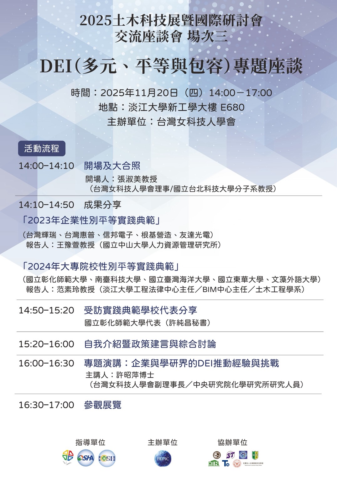 說明: 一、旨揭論壇係該中心舉辦之「土木科技展暨國際研討會」場次3活動,該座談會由台灣女科技人學會主辦,活動聚焦多元、平等與包容(DEI)之企業實務、大專校院推動成果、跨領域交流及展覽導覽。 二、座談內容: (一)企業實務分享: 1、「2023年企業性別平等實踐典範」案例分享(輝瑞大藥廠股份有限公司、惠普科技股份有限公司、信邦電子股份有限公司、根基營造股份有限公司及友達光電股份有公司)。 2、「2024年大專院校性別平等實踐典範」案例分享(國立彰化師範大學、南臺學校財團法人南臺科技大學、國立臺灣海洋大學、國立東華大學及文藻學校財團法人文藻外語大學)。 (二)受訪實踐典範學校分享:國立彰化師範大學代表。 (三)專題演講:「企業與學研界推動 DEI 的經驗與挑戰」,由許昭萍博士主講。 (四)參觀展覽:會後安排展示區導覽交流。 三、該座談另提供遠距參與方案,於同一地點僅須繳交一次註冊費,適合全班級或研究室共同參與;以團體出席者,倘提供如附檔格式之領隊代表簡介,主辦單位將特別唱名介紹。5人以上團體報名者,請逕與聯絡窗口洽詢優惠事宜。 四、報名網址:https://www.constructionlaw.tku.edu.tw/regi/,個別場次報名,選填「其他參與者」勾選擬個別場次。 五、檢送活動海報、簡介格式範本及相關連結QRcode。 六、聯絡窗口:本校BIM中心范素玲主任、活動總監秦佑宇;行動電話:0916-836-198。