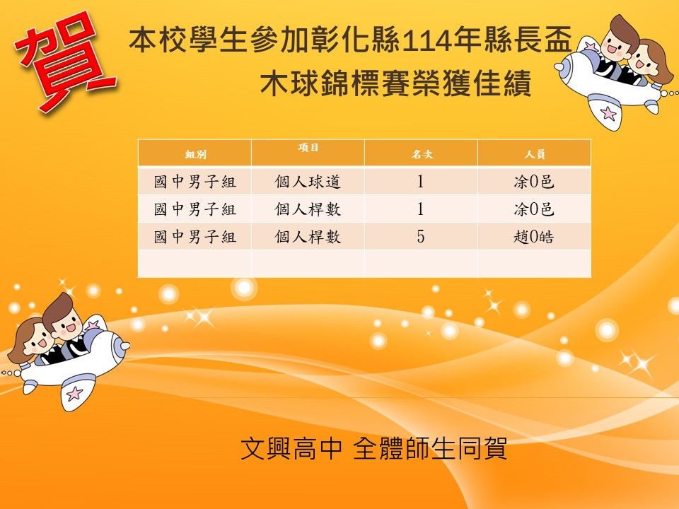 賀本校學生參加彰化縣114年度縣長盃木球錦標賽榮獲佳績