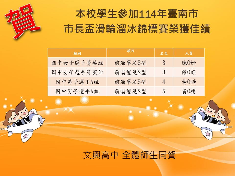 本校學生參加114年臺南市 市長盃滑輪溜冰錦標賽榮獲佳績