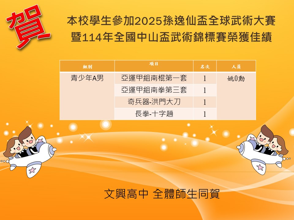 本校學生參加2025孫逸仙盃全球武術大賽 暨114年全國中山盃武術錦標賽榮獲佳績