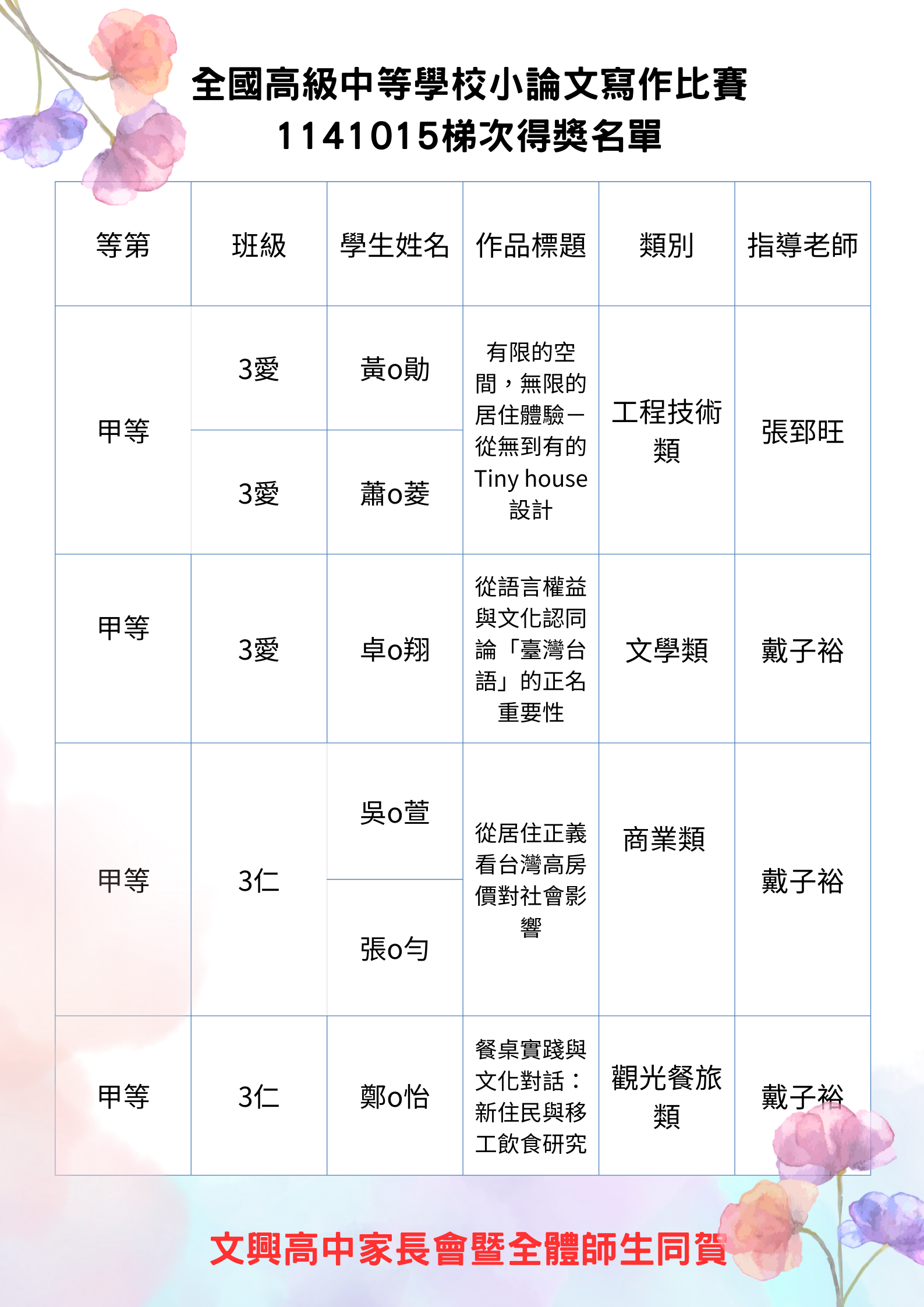 1141015梯次全國中學生小論文寫作競賽得獎名單