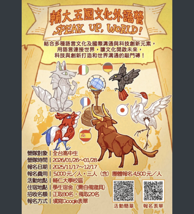 一、活動緣起:本校外語學院秉持「以語言連接世界、以文化開啟未來」之辦學理念,結合多國語言、文化體驗與國際禮儀等課程,期望透過營隊形式激發高中生對外語學習的興趣,引導學員理解不同文化背景下之溝通方式與交流精神。本營隊並融入科技創新與國際溝通之學習元素,協助學員建立與世界對話之橋梁,使學生在探索語言與文化的過程中開拓國際視野,厚植未來競爭力。 二、活動宗旨:在全球化與數位化快速發展的時代,語言已超越溝通工具,成為促進理解、連結世界的重要媒介。本營隊以「Speak Up,World! 外語營」為主題,旨在引導高中生接觸多國語言文化,體驗國際交流精神。透過語言、文化與科技創新之融合課程,協助學生建立面向世界之格局,並提升其跨文化敏感度與國際視野。 三、營隊資訊如下: (一)營隊對象:全台高中生。 (二)營隊時間:2026年1月26日(星期一)至1月28日(星期三),三天兩夜。 (三)報名期間:2025年11月17日(星期一)至12月17日(星期三)。 (四)活動地點:輔仁大學校區。 (五)住宿地點:本校學生宿舍(需自備寢具)。 (六)報名方式:掃描海報上QR code報名表單。 (七)招收名額:正取80名,備取20名。 (八)費用: 1. 個人報名:每人新台幣5,000元。 2. 三人(含以上)團體報名:每人新台幣4,500元。 四、營隊目標:本營隊著重能力養成,期望學生於參與後能具備以下核心能力: (一)語言基礎運用能力:掌握日、德、義、法、西五國基礎會話表達技巧。 (二)跨文化理解能力:辨識不同文化之價值觀、禮儀與溝通方式。 (三)外交與國際議題思辨能力:透過外交實務案例建立分析能力與表達策略。 (四)科技整合與創新學習能力:運用數位工具提升語言學習與國際交流效率。 (五)團隊協作與自信表達能力:於多國文化情境活動中養成協作精神與公開表達之自信。 五、檢附活動簡章及海報電子檔,惠請協助公告並轉知貴校學生踴躍參與。(如附件一之照片、附件二之連結所示。) 六、聯絡窗口如下: (一)輔仁大學義文三 吕稚亭 0909030562 (二)輔仁大學日文二 林毅鎧 0905402980 (三)輔仁大學西文二 王怡凡 0979722750 七、補充資料:詳如附件一、附件二。