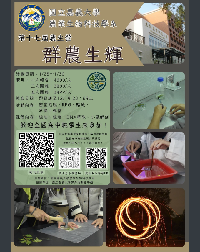 國立嘉義大學農業生物科技學系115年1月28日至1月30日舉辦農生營