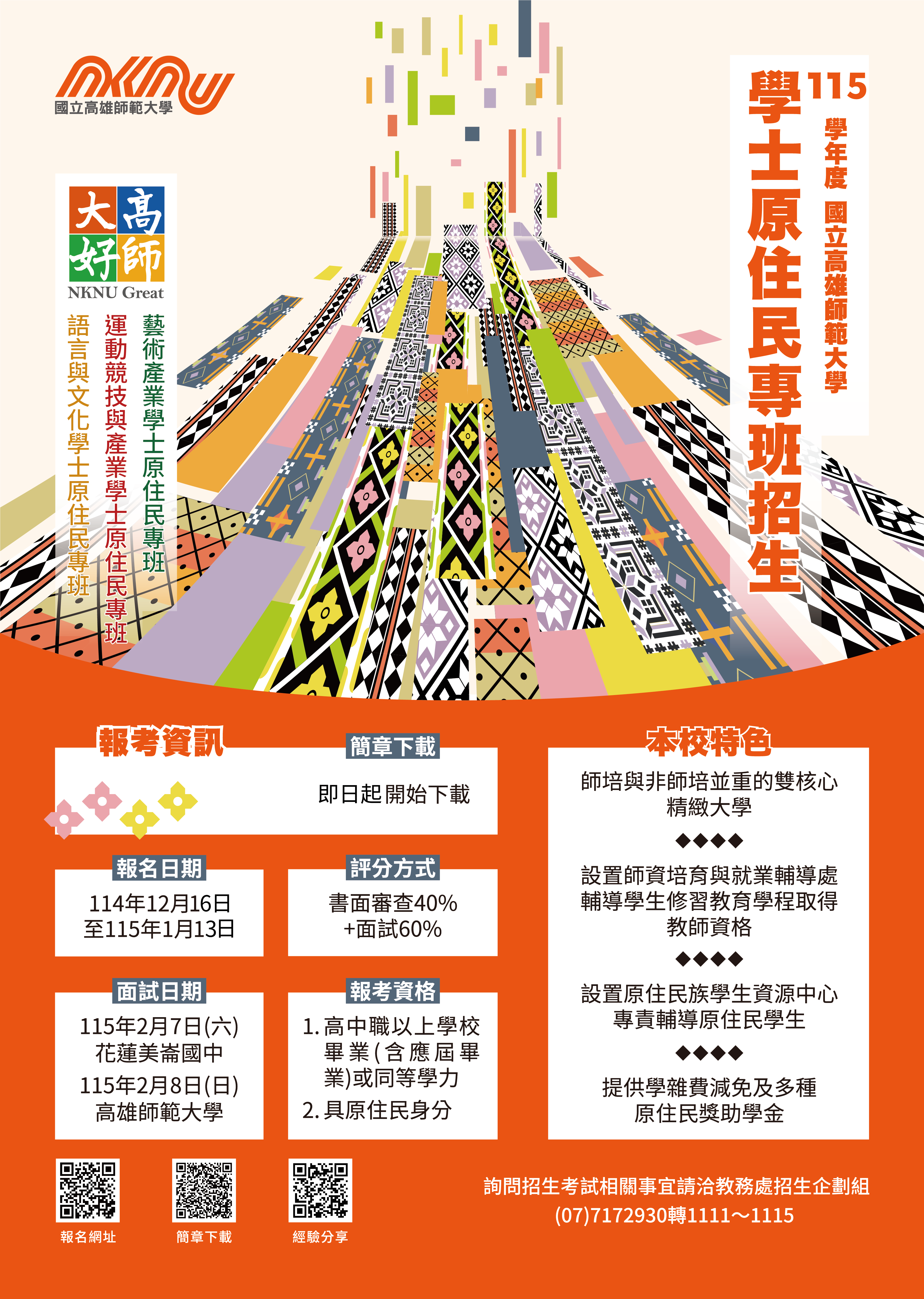 主旨:檢送本校115學年度學士原住民專班招生資訊,敬請協助公告並轉知所屬,歡迎符合資格考生踴躍報考,請查照。