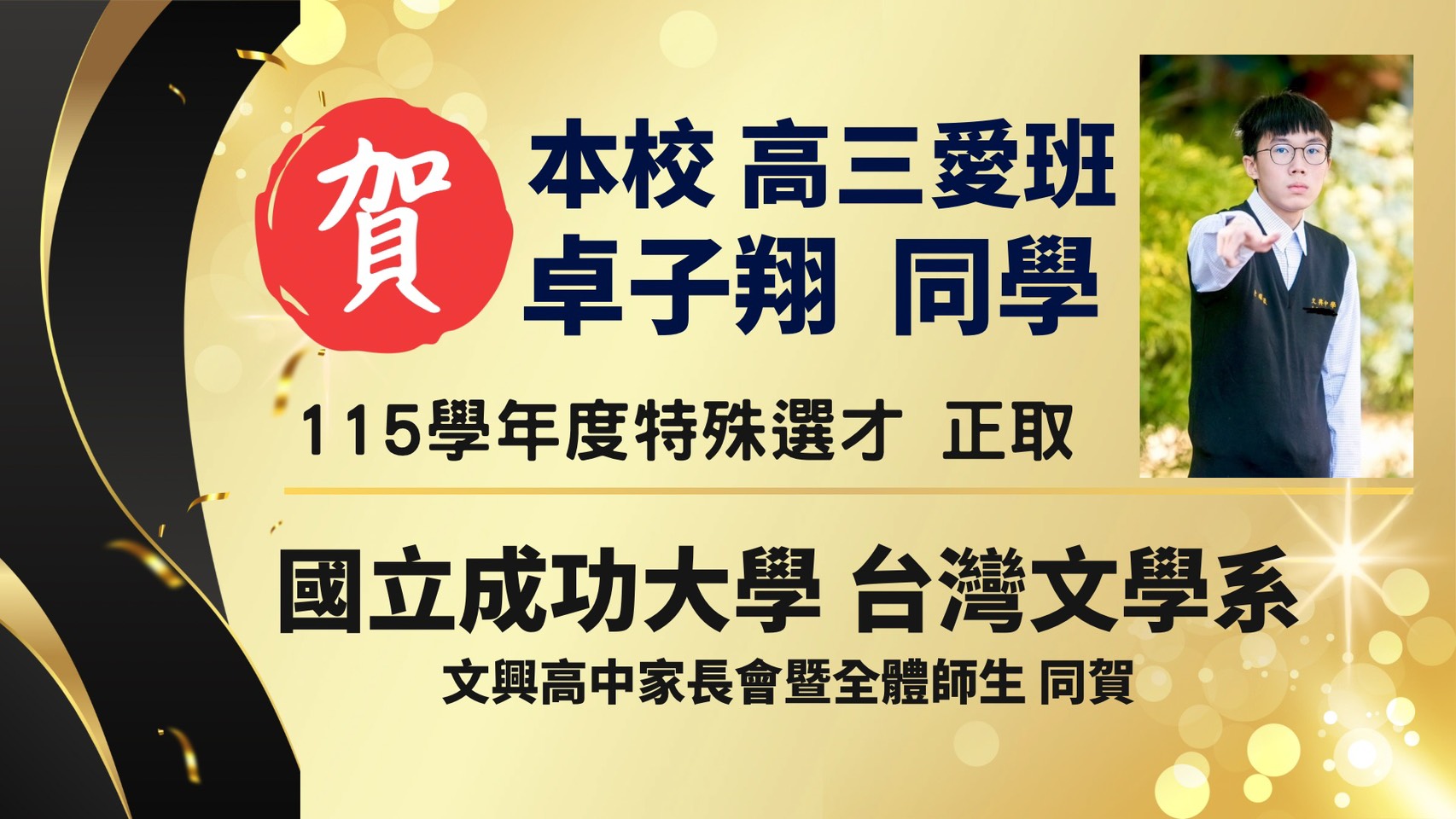 賀~卓子翔同學參加115學年度特殊選才錄取國立成功大學台灣文學系
