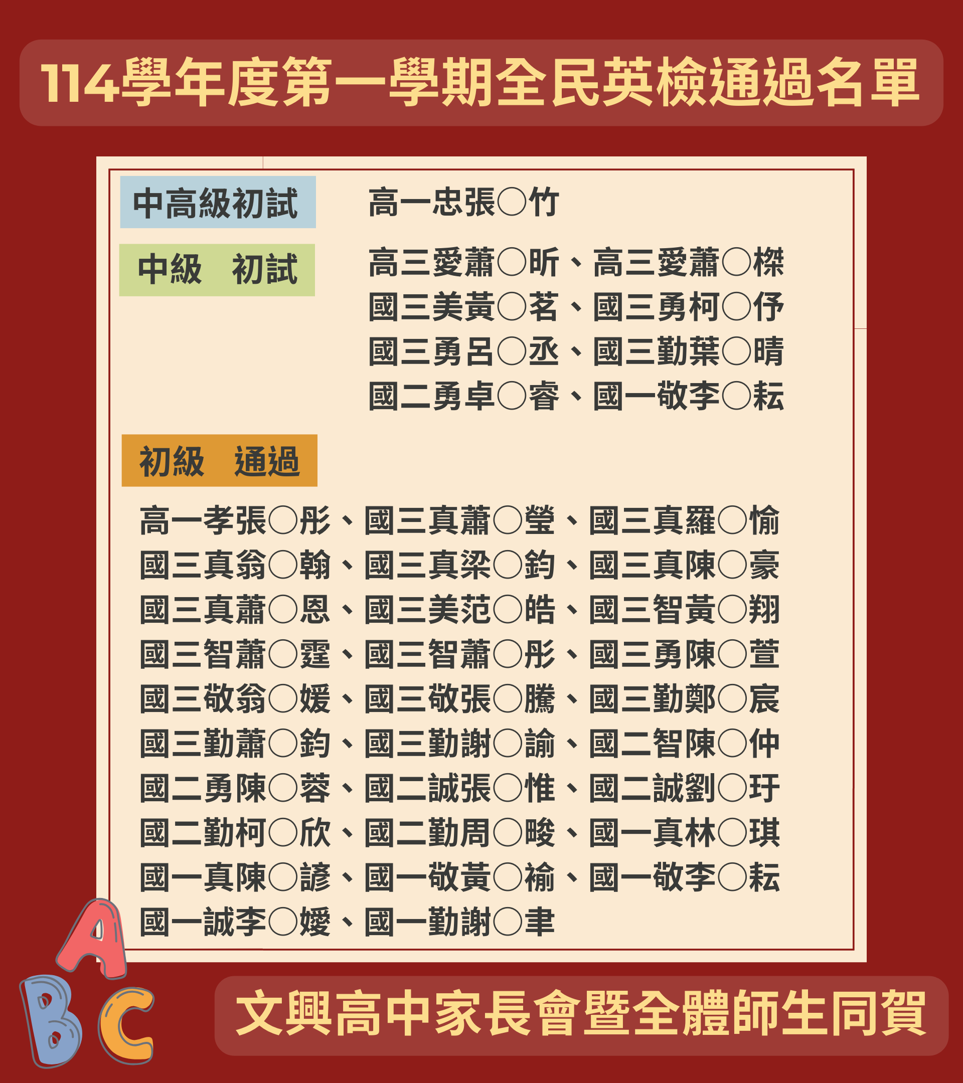 賀!114學年度第一學期 GEPT全民英檢測驗 通過