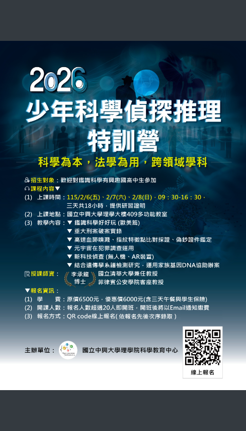 說明: 一、本營隊以鑑識科學為核心,結合刑案解析與新興科技應用,培養學生科學辦案之基礎素養與實務理解。 二、活動相關資訊: (一)活動日期:115年2月6日(星期五)至2月8日(星期日),共三日。 (二)活動時間:每日09:30至16:30,共18小時。 (三)活動地點:中興大學理學大樓四樓409多功能教室。 (四)招生對象:對鑑識科學有興趣之國中、高中學生。 (五)活動費用:新台幣6,000元整(含午餐、保險)。 (六)備註:全程參與將提供研習證書。 三、隨函檢附活動海報,敬請惠予協助公告轉知,鼓勵貴校學生踴躍參與。