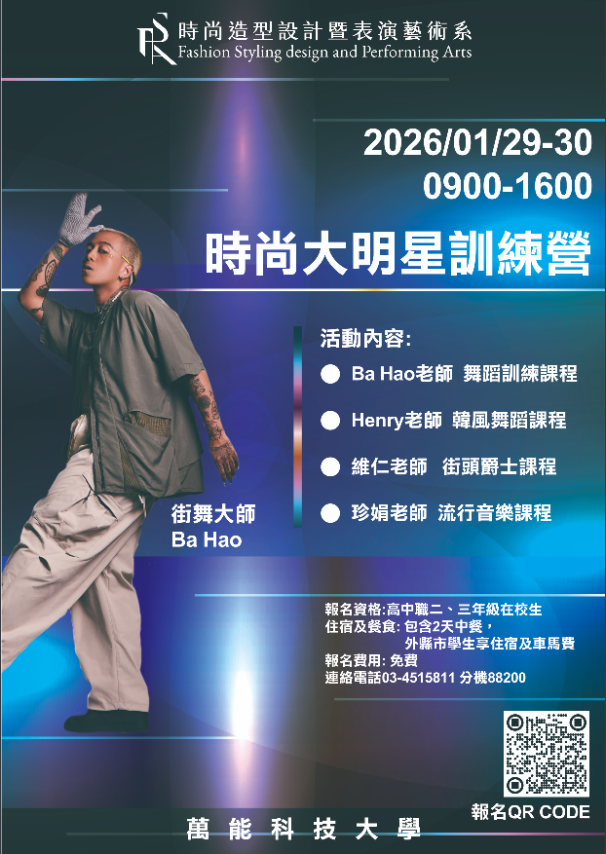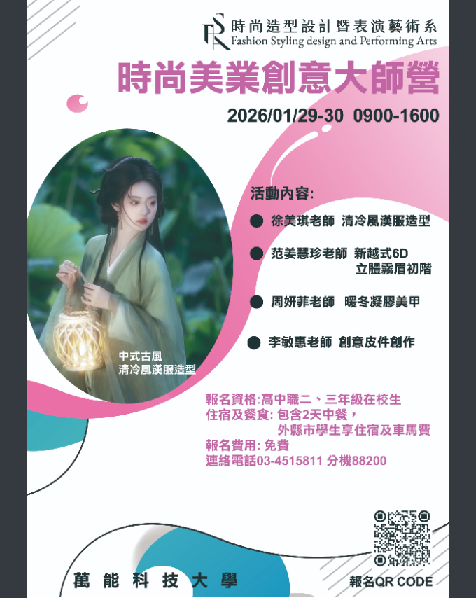 一、報名資格:高中職二、三年級在校生。 二、報名方式:即日起一律採網路報名,詳見海報。 三、日期:2026年1月29日至30日9時00分至16時00分。 四、住宿及餐食包含2天中餐,外縣市學生享住宿及車馬費。 五、活動洽詢:本校時尚造型設計暨表演藝術系,聯絡電話:03-4515811分機88200。