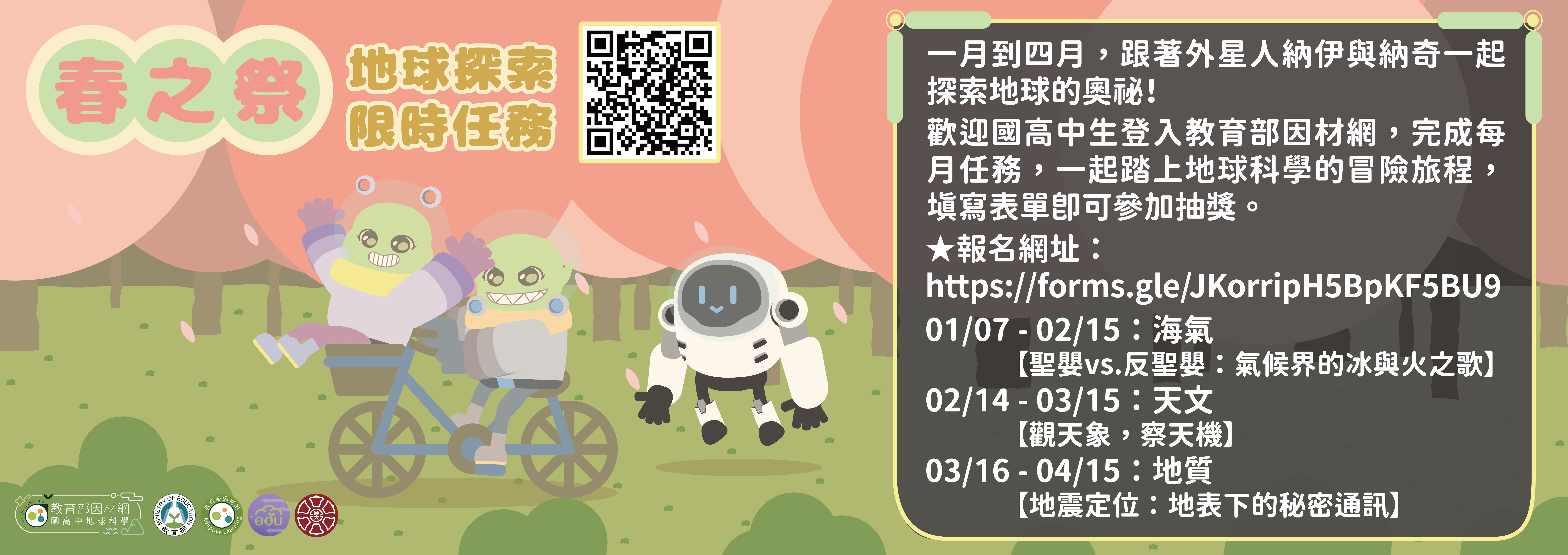 國立臺灣師範大學辦理教育部2026年因 材網地球科學跨校學習活動「春之祭——地球探索限時任 務」活動資訊