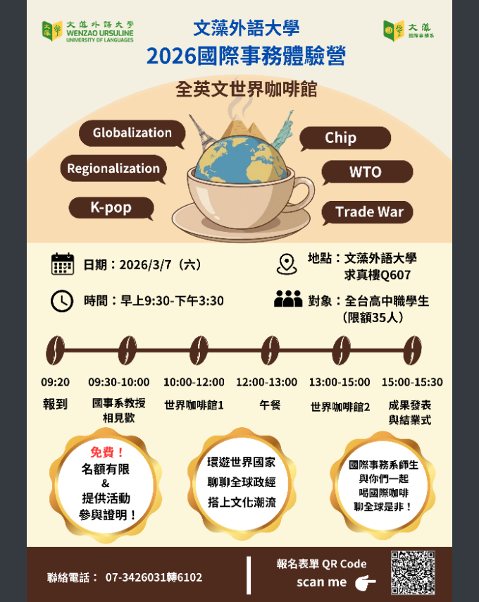 文藻外語大學國際事務系舉辦之「2026國際事務體驗營–全英文世界咖啡館」活動訊息