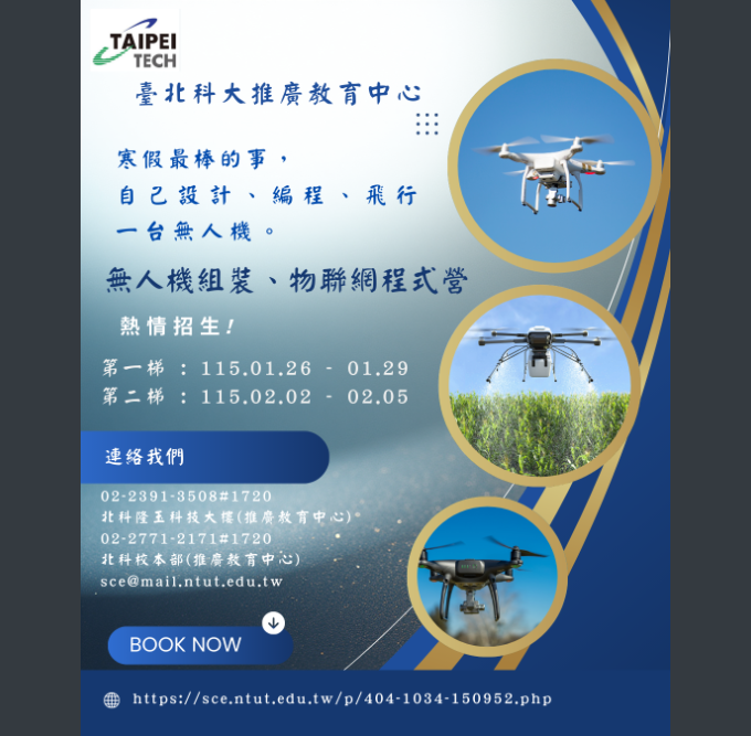 國立臺北科技大學進修部推廣教育中心預定於115年01月26日(第一梯)及115年02月02日(第二梯)起開辦【無人機組裝、物聯網程式營】課程