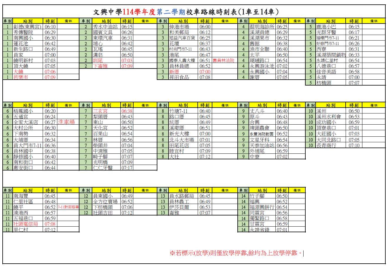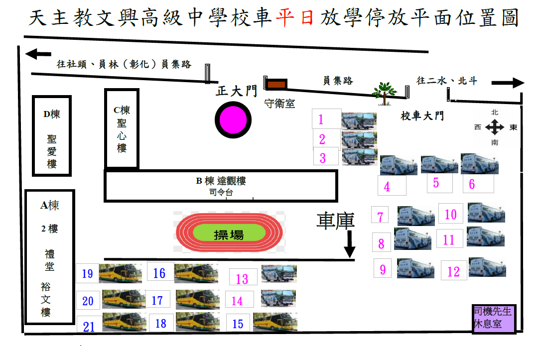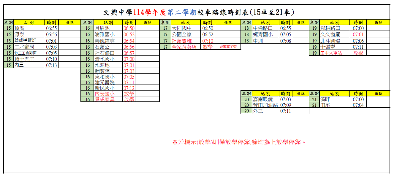 文興中學114學年度第二學期校車路線時刻表&放學停放平面位置圖(1~21車)